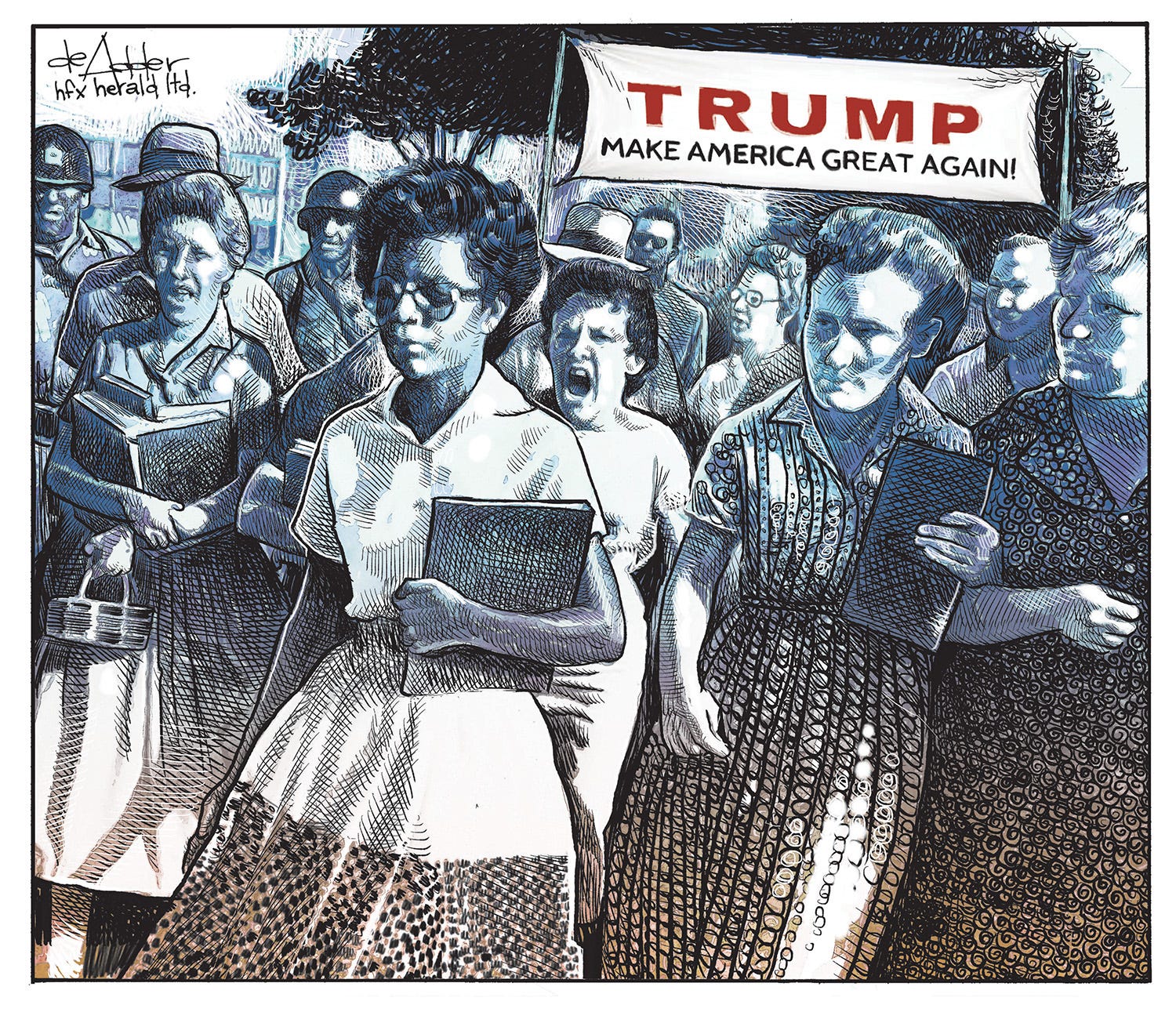 Donald Trump's presidency pushed America backward, reviving 1950s-style nationalism and division. His rhetoric on immigration, race, and law and order echoed a pre-civil rights era, appealing to those nostalgic for a time of white dominance and isolationism. His policies fueled deep cultural divides, rolling back progress on civil rights and equality, and leaving the country more polarized than ever.